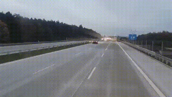 Az egyik főszereplő a belső sávban közlekedő vétkes, a reflektorfény viszont az őt alig elkerülő Mercedesé. Nem tudni, hogy észrevette-e, de két kamion is villogtatással próbálta figyelmeztetni, a reddit kommentelői szerint a Mercedes kitérést biztosító kormányzásasszisztense is segíthetett, mindenesetre kis szitálás után össze sikerült szedni az autót.
