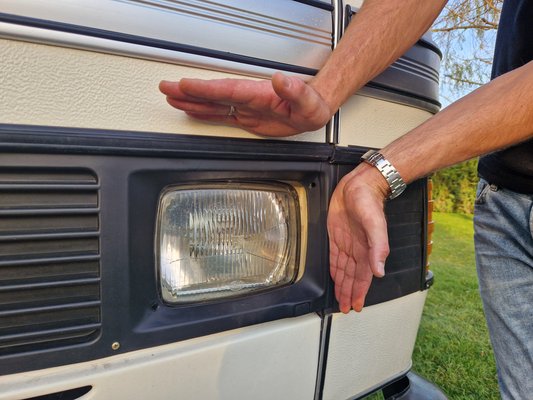 Cserélendő volt a hátsó csomagtérajtó is, menthetetlen állapotban volt már. A kocsi farán motorszállító felépítmény volt a megvételkor, ez nem került vissza rá. A Bárdi Autóból sikerült megvásárolni az utolsó darab hűtőrácsot. Szélvédőt az interneten láttam 70-80 ezerért s egymillióért is hozzá. Speciális, ugye szélesebb mint a T1-esé volt. A matricákat dekoros ismerős gyártotta újra. Felkerült a homlokfelület bal felső sarkára az Eriba is. Ez azért is aranyos, mivel az Eriba és a Hymer 1980-ban olvadt össze, e kocsi gyártási évében.