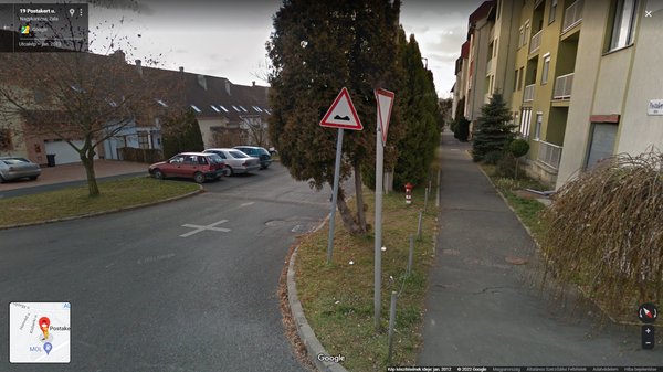 Sajnos a fenti konkrét szituáció majdnem szabályos is, a településrendezésről szóló jogszabály szerint ugyanis: "...a gyalogos-átkelőhely nélküli forgalmi csomópontban az úttest szegélyének sarokpontjától mért 5,00 m-en belüli részén 0,50 m-nél magasabb építmény, kilátást zavaró köztárgy, berendezés és növényzet nem állhat." Nem mértem le személyesen, de a Street View-n látható Citroen Xsara 4,1 méteres hosszából ítélve a sarokponttól mérve éppen meg is lehet a szükséges öt méter, a rutinszerű ellenőrzést végző szakember szeme meg úgyis felfelé kerekít.