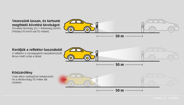 Természetesen nálunk sem lehet sem a ködzárófényt, sem az első ködlámpákat ütre-fütre bekapcsolni, de a használatukat rögzítő előírás nem annyira egzakt, mint a német. A KRESZ ugyanis úgy fogalmaz, hogy: „Tompított, vagy távolsági fényszóró helyett, vagy mellett ködfényszórót, továbbá hátsó helyzetjelző ködlámpát abban az esetben szabad használni, ha a látási viszonyok ezt indokolják.” Hát, valljuk be ez így, ebben a formában nem teljesen egyértelmű, hiszen hogy mikor érzi úgy valaki, hogy most már indokolt a bekapcsolásuk, az nagyban függ a tapasztalatától és a tűrőképességétől, de a döntéshozatalba még a fáradtság is beleszólhat.