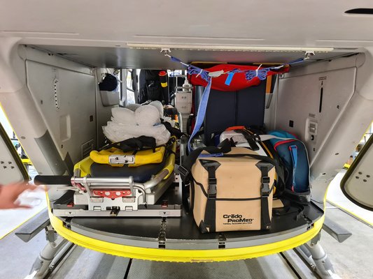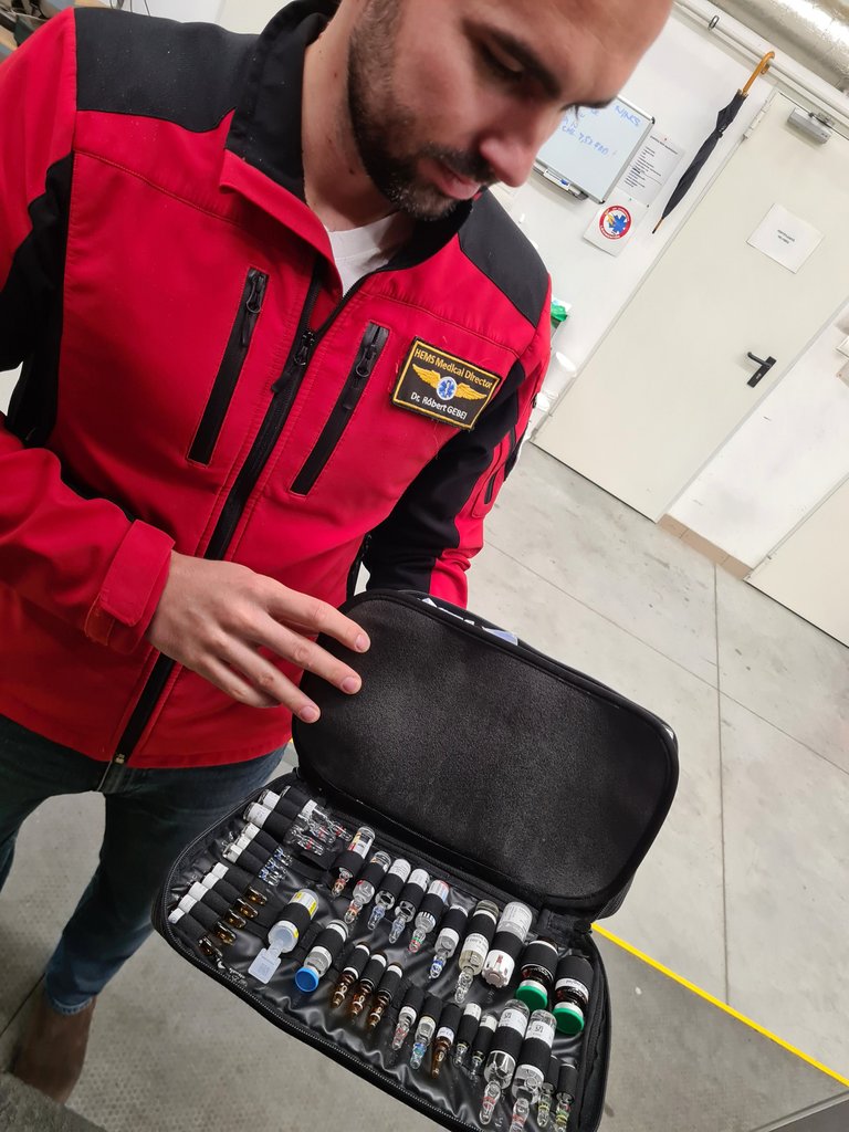 Amint már említettem, a gépek felszereltsége magas, néhány egészen meglepő dologra is képesek a tapasztalt orvosok és paramedikusok, akik minden esetben többéves mentős gyakorlat után nyerhetnek felvételt a légimentők kötelékébe. A szokásos dolgokon (fecskendők, kötszercsomagok, gyógyszerek, különböző orvostechnikai eszközök, stb.) túl van a fedélzeten gyógyszeradagoló berendezés, automata mellkaskompresszióra képes eszköz, a cég által fejlesztett légútbiztosító modul (ez egy táska a megfelelő eszközökkel és gyógyszerekkel előre felszívott fecskendőkkel) vérhűtő 0- vörösvértest-koncentrátummal, vérátömlesztéshez szükséges eszközök és a már említett ügyes kis ultrahang készülék. Ennek segítségével akár testüregi vérzéseket, belső sérüléseket, de a szem mögötti ideg méretének mérésével akár koponyaűri nyomásfokozódást is időben fel lehet deríteni. Még a hordágy tartókonzolja is speciális, mechanizmusának köszönhetően oldalról és a gép hátulja felől is a géptestbe fordítható rajta a páciens.