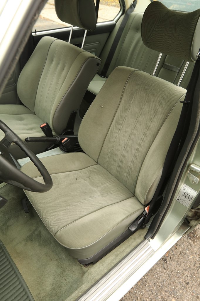 Na, mindegy is, valaki ezt a BMW-t választotta, s rendelt bele tetőablakot, a külsőhöz passzoló szép zöld – piniengrün – belteret ikszelt be, jutott bele első-hátsó ködlámpa. ABS 1981 őszétől volt rendelhető, ebbe nem kérték. Annak idején a jobboldali tükör sem volt magától értetődő – a nyolcvanas évek közepétől adták alapárért –, de erre a kocsira már szereltek, felárért. Viszont érdekes, hogy úgy alakult, kizárólag a bal oldali állítható belülről, a jobb tükörlapja csak akkor, ha letekeri az ember az ablakot, s kézzel mozgatja a tükörlapot – még a nagyobb motoros változatokhoz sem adták alapárért a jobb tükröt.