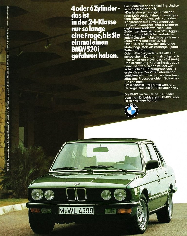„4 vagy 6 henger? Ez a kétliteres osztályban csak addig kérdés, amíg nem ment egy 520i-vel.” Szólítja meg az olvasót a szerző. Kisebb betűvel több korabeli (1981-es) német nyelvű autós szaklapból – például az Auto Motor und Sportból – idéznek, amely cikkek szerzői az 520i kulturáltságát, teljesítményleadását, gázreakcióját, stb. dicsőítették. De a legaranyosabb a szöveg vége, amely szerint, amennyiben az olvasónak további cikkekre – illetve szakcikkek kivonataira – van szüksége, írjon nyugodtan a BMW Kontakt címére Münchenbe, postafordultával küldik. Ha pedig – már nincsenek kérdései és – vásárolni szeretne, keresse fel a kereskedések egyikét. Kíváncsi lennék, hányan írtak, további szakvéleményeket igényelve a kocsiról...