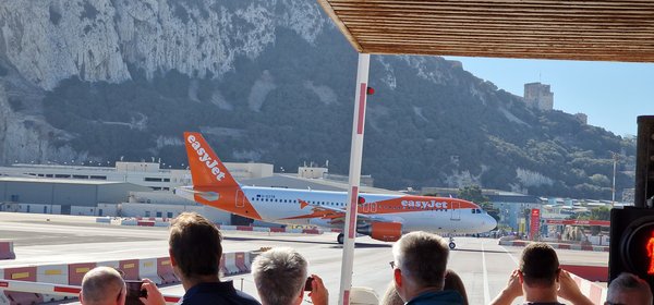 Ez egy veszélyt jelző tábla, amely arra hívja fel a figyelmet, hogy repülőgép keresztezheti az utadat. Szerencsénkre épp jókor voltunk jó helyen, tekintve, hogy pirosra váltott a lámpa, majd leengedték a sorompót. Egy kis úttisztítás után elgurult előttünk egy EasyJet gép, majd megfordult, és végrehajtott egy sikeres felszállást, mindezt úgy, hogy az eddig általunk használt út számára kifutópályává avanzsált. Utána sorompó felnyit, és az eddig megszokott rendben mehet is tovább a forgalom.