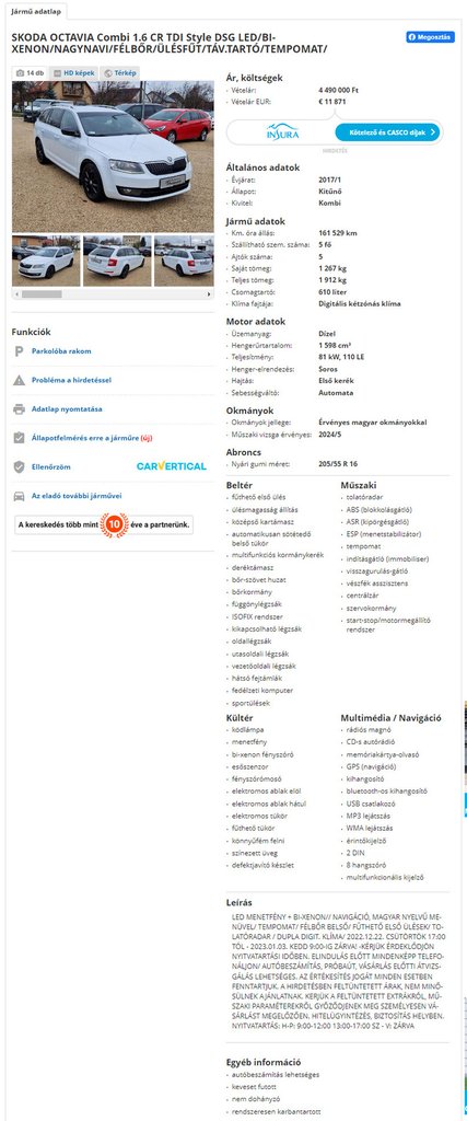 Az autó hirdetési szövegében azonban nem hívták fel a figyelmet sérülésre, az állapotához a “kitűnő” rubrikát ikszelték be a HaHu-n. Az ár nem volt sem alacsony, sem magas, 4,5 millió forintért úszkálni lehet a 2016-2018 közötti dízel Octaviák között. A fényképek szintén nem árulkodtak, majd egy előzetes telefonbeszélgetés során, rákérdezésre sem említették, hogy az autó korábban súlyosan sérült. Még akkor sem, amikor jeleztem, hogy vinnék átvizsgálós embert. “Csak az eleje sérült kicsit” - nevettem magamban, Papp Tibi tavaly januárban pont majdnem ezzel a címmel írt egy nagyon hasonló esetről.