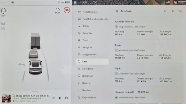 Én is tartottam a középen elhelyezkedő egykijelzős infotainment rendszertől: hogyan fogom megszokni? Nem lesz zavaró? Nem lett, egy nap a megszokás. A kezelőszervek: két gomb, két kar – és ennyi. És működik, megszokható. Magyarországon egyelőre ingyenes a Premium Connectivity (internet kapcsolat az autóban), ez tartalmaz ingyenes Spotify-fiókot, reklámok nélkül. Hallgathatom kedvenc podcastjeimet, zenéimet. A vezeték nélküli frissítés zseniális: beállok otthon az udvarra, csatlakozik az autó a wifihez, letölti a frissítést, és hirtelen lesz egy-két új funkció. Ez megunhatatlan. Csak az a szerencsétlen automata ablaktörlő működne már rendesen... Esőben nem nagyon töröl, szárazon annál inkább. Itt azért van hova fejlődni.