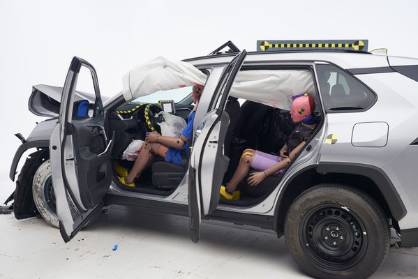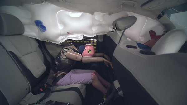 Az Escape és a XC-40-es hátsó ülésén utazó tesztbábut okosabb biztonsági öv védte, így nem érte túl nagy nyomás a mellkasát. Jól illeszkedett a vállához a biztonsági öv ferde része, így az nem csúszott be az öv alá. A vízszintes rész is végig a csípőn maradt a baleset során; a bábu nem ütötte be a fejét a vezető ülésébe. A RAV4-es annyiban teljesített rosszabbul, hogy a hátul ülő biztonsági öve felcsúszott a hasára, emellett a feje becsúszott a függönylékzsák és az ablak közé.