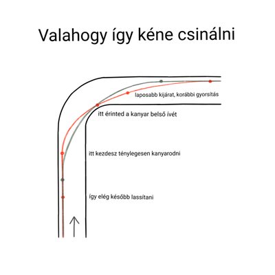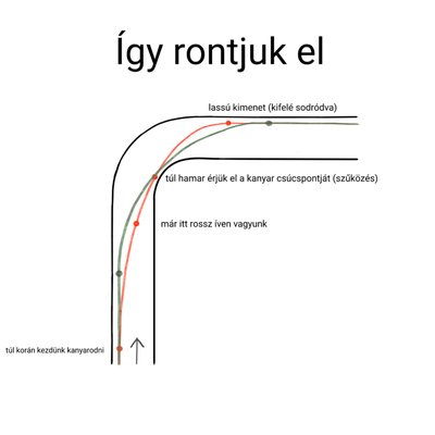 Ehhez képest ezt valahogy úgy kellene helyesen megoldani, hogy ameddig csak tudunk, addig kint maradunk a kanyar külső ívén. Tehát egy jobbra kanyarodáskor balra húzódunk, egy balra kanyarodáskor pedig jobbra. Az autót kint tartjuk, ameddig lehet, és megcélozzuk a kanyar belső ívének azt a pontját, ami már nem törik tovább, majd akkor adunk gázt, amikor már (közel) egyenesbe került a kormányt. Így egyfelől laposabb ívet vehetünk az autóval, azaz kevesebbet kérünk a gumitól, a futóműtől, a fizikától, tehát a lehető legbiztonságosabb. Másfelől akár hiszed, akár nem: ez így még gyors is.