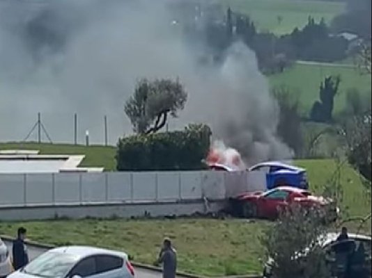 Ami igazán nem vicces, hogy a felvételen 0:24-nél úgy csapódik be a kerítés mögötti medencébe a 296 GTB egy darabja, hogy ha valaki éppen ott úszkál, az biztosan nem köszöni meg. Alig valamivel később látszik, hogy a Berlinetta erősen füstölni kezd, később pedig ki is gyullad, és végül közel porig ég.