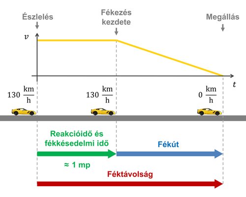 Tulajdonképpen egyszerű, de mégsem olyan egyszerű, a megértéséhez ismerni kell a fékút és a féktávolság fogalmát. Anélkül, hogy nyakig merülnénk a dologba: a teljes féktávolság a reakcióidőnk (ez normál esetben nagyjából egy másodperc, ami alatt szinte csak felfogtuk a helyzetet) alatt megtett útból, illetve a fékútból adódik össze. A fékút az a távolság, amit a fékezés megkezdésétől a teljes megállásig teszünk meg.