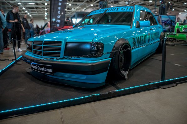 Az autóról tudni kell, hogy hosszú évek óta ugyanaz a tulajdonosa, motorikusan nem történt rajta módosítás, a külsejét viszont úgy váltogatja, mint egy kaméleon, a tulajdonos fejében megszületik egy gondolat, ötlet, terv és addig nem nyugszik, amíg az autó át nem alakul annak megfelelően. Ezért is van az, hogy egyik évben még gyönyörű bordó színben, fekete Borbet feliratokkal lehetett látni, most pedig a Bombay Sapphire gin friss türkizkék színében, TeckWrap fóliával, domború Mercedes-Benz logóval az orrán feszített a standon. Természetesen airride van alatta, a futóművet pedig éppen annyira alakították át, hogy az elől 16, hátul pedig 17 colos Borbet felnik elférjenek az autó alatt. Az autó szerencséje, hogy a tulajdonos karosszérialakatos, így nemcsak a fólia miatt tűnik ki a többi ültetett 190E közül, hanem azért is, mert a spoilerszett teljesen egyedi, a tulajdonos találta ki és késztette el saját kezűleg. És hogy láthatjátok-e az utakon? Nem igazán. Nem azért, mert az átalakítások miatt alkalmatlan lett arra, hogy eljusson A-ból B-be, hanem azért, mert ez az autó már sokkal többet jelent a tulajdonosának annál, hogy elguruljon vele bevásárolni, érthető okokból félti, de kiállításokon, rendezvényeken gyakran meg fog fordulni a Bombay Merci.