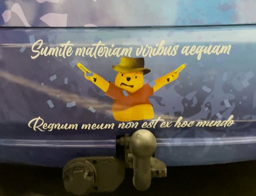 Sajnos nem sikerült találkozni a tulajdonossal, pedig van egy olyan érzésem, hogy elég érdekes sztori van a dizájn és a latin idézet mögött. Annyit sikerült kiderítenem, hogy a „Sumite materiam vestris, qui scribitis, aequam viribus, et versate diu, quid ferre recusent, quid valeant umeri.” idézet Horatius Ars poeticájából származik és Illyés Gyula fordítása szerint annyit tesz, hogy „Tárgyat erőtökhöz képest válasszatok, írók! Fontolgassa soká ki-ki, hogy mit bír meg a válla és mit nem.” Olyasmit jelent ez a bölcsesség, hogy csak megalapozottan, tények alapján szabad ítélkezni, nem pedig indulatból. Az alsó sor, vagyis a „Regnum meum non est de hoc mundo.” pedig a Bibliában olvasható, János evangéliumának a része. Pilátus ugye feltette Jézusnak a kérdést, hogy „Te vagy a zsidók királya?”, és nem igazán értette Jézus válaszát, majd Jézus a Mazdán szereplő idézettel válaszolt neki (ha valaki azt mondja nekem pár nappal ezelőtt, hogy ezt a mondatot valaha leírom, konkrétan körberöhögöm), ami magyarul azt jelenti, hogy „Az én királyságom nem ebből a világból való.” Amennyiben valaki ismeri az autó tulajdonosát, megköszönném, ha átadná neki az üzenetemet: írjon, hívjon, küldjön postagalambot vagy füstjeleket, mert nagyon szeretném megkérdezni tőle, hogy mi volt a dizájn mögötti gondolat.