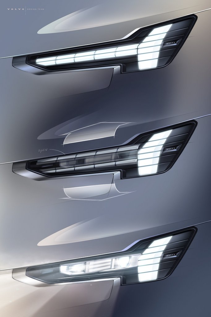 Ez az ügyes megoldás úgy néz ki a gyakorlatban, hogy alapesetben a Volvók orrát meghatározó, fektetett T-betű szára több kis modulból áll, és normál esetben ezek világítanak. Azonban amikor kevés a menetfény, akkor a T szára felfelé és lefelé eltűnik, majd ezek mögött megjelenik a tompított és a reflektor. Valódi értelme nincs, de biztos, hogy ha belekerül a végleges modellbe, akkor már emiatt is emlékezetes maradhat az EX90.