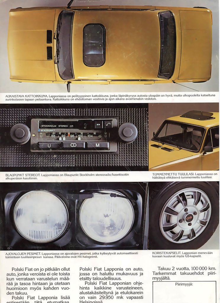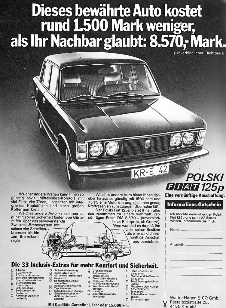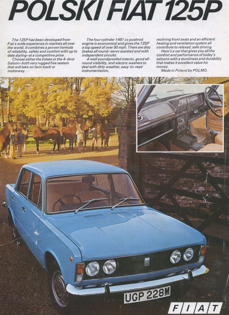 Ebben a hirdetésben már említik, hogy kombi kivitelben is gyártják a kocsit – 1978-ben ezzel megnyerték az Év kombija címet az Egyesült Királyságban. Később platós is készült belőle, sőt hosszú tengelytávú változatok és pár darab hatajtós, nyolcszemélyes hosszú kabriolet is! Négy fejlesztési fokozatot élt meg a kocsi, 1972-ben botváltót kapott, 75-től egy frissítés során többek között a négy függőleges hátsó lámpát téglalap alakúra cserélték, modernebb a műszerfal és a volán, 1983-ban pedig lejárt a Fiat liszensz szerződése, a kocsi neve ekkortól FSO 125p. 1978-tól elindult a Polonez gyártása is, az utolsó frissítés során az ő hajtásláncát kapta meg a típus, s kerekek lettek a műszerei.
