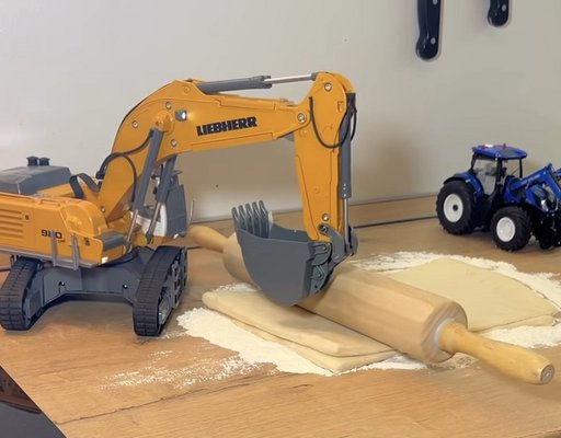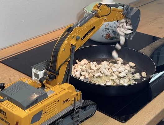 A videó főszereplője egy nagyobb, sárga exkavátor, illetve egy kis kék traktor, amin homlokrakodó kar is van. Mivel mindkettő távirányítós, technikailag hibátlanul alkalmasak rá, hogy emberi kezek helyett megoldják a főzés egy részét. Sőt, az igazi változataikhoz képest határozott előnyük, hogy beférnek a konyhába az épület roncsolása nélkül is.