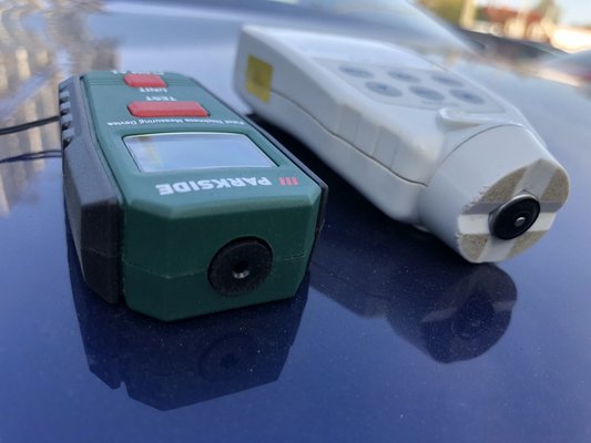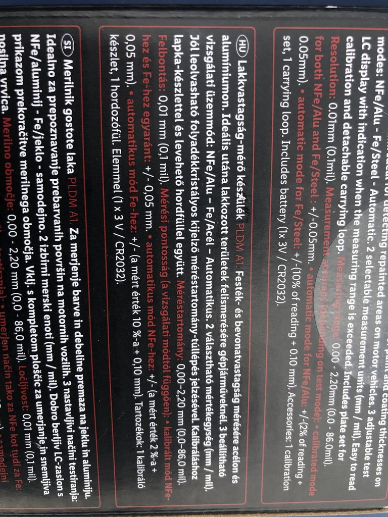 Tény, hogy kalibrált üzemmódokban elvileg sokkal pontosabb a műszer (+/- 0,05 mm tűrés), „Auto” módban viszont alumíniumnál ehhez még hozzájön a mért érték 2 százaléka, vaslemeznél meg a mért érték 10 százaléka. Ez azt jelenti, hogy tipikusan 0,06-0,07 mm-t tévedhet oda-vissza (hiszen általában vaslemezből készült autókat vizsgálunk, amiken jó esetben 1-2 réteg festék van). Másképpen: 0,06-0,07 mm az 60-70 mikron. Ez mondjuk elég rosszul hangzik, ha tudjuk, hogy egy gyári bevonatréteg valahol 80-120 mikron közt van. De gyanítom, ennyit azért csak akkor hord félre, ha több dolog is összefog ellenünk. Mint mondtam, a kalibráló lemezt nagyjából jól mérte, ahány általam ismert festékvastagságú autóra rámértem, azokon is jó értékeket mondott.