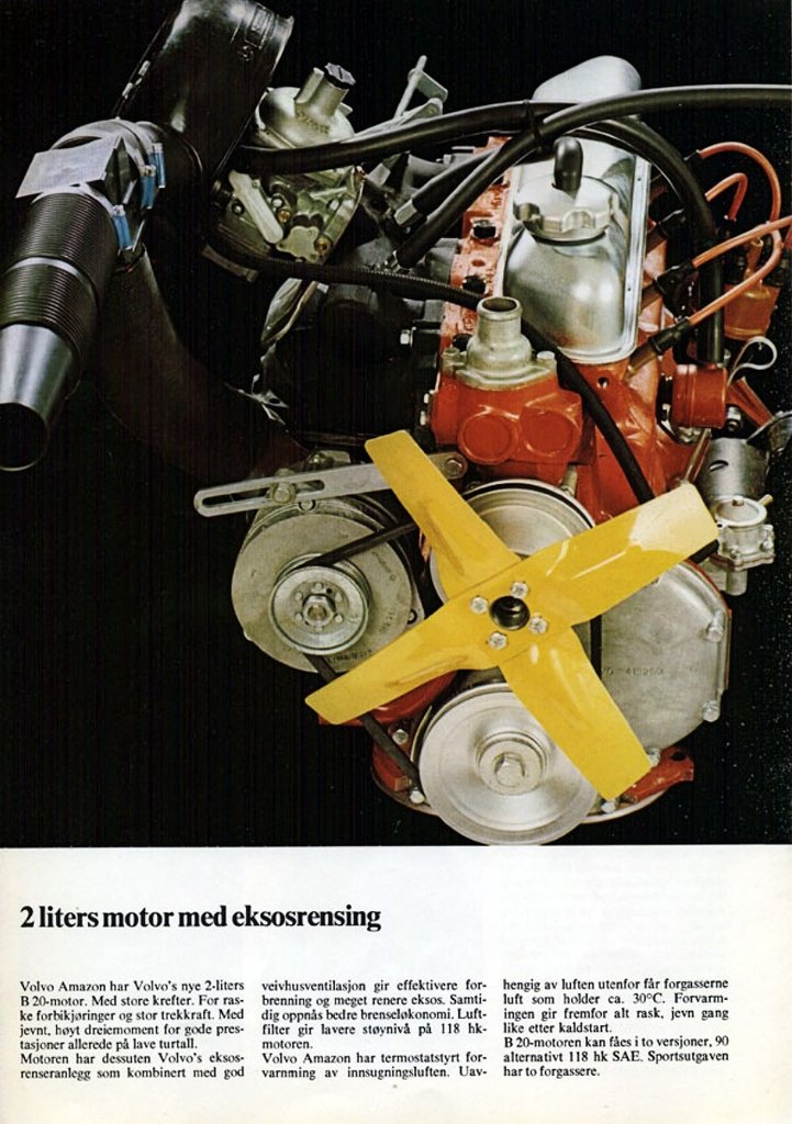A pirosra festett motortömbbel szerelt motorok legendásak a svédeknél. Kezdetben B18-asként gyártották őket – a szám a lökettérfogatra utal, az 1,8 literest 1961-től készítették. Az a motorcsalád, amely bár OHV vezérlésű, tolórudas szelepvezérlést kapott, 6500-as percenkénti fordulatig simán kipörgött, miközben nagyon tartós is volt. Ilyen dolgozik a világ legtöbbet – közel ötmillió kilométert (!) – futott autójában, a Guinness-rekorder P1800-asban is. Nem lehet véletlen, hogy az Amazont Amerikában, mint az elpusztíthatatlan "családi sportautó 100 ezer mérföldes hírnévvel" szlogennel reklámozták. Egy reklámfilm pedig úgy mutatta be a kocsit, hogy keményen hajtják kavicsos utakon. A reklám mondandója az volt – ez ma már lehetetlen lenne, de hihetetlen szellemes –, hogy „És úgy vezetheted, mintha utálnád. Olcsóbb, mint a pszichiátria”.