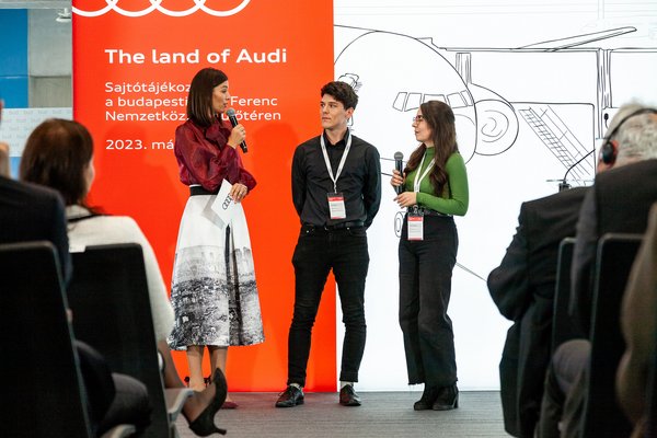 Arról van szó, hogy a repülőgépeket a terminállal összekötő, zárt folyosó – vagyis utashíd – külsejére és belsejébe kellett dekorációt tervezniük. A nem túl szerény, The land of Audi, vagyis az Audi földje szlogen köré kellett építkezni, ami a gyakorlatban azt jelenti, hogy az Audi már 30 éve jelen van Magyarországon a győri gyár révén.