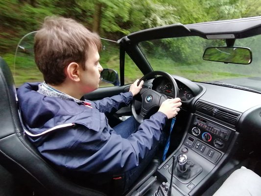 Méretei számomra kívül-belül ideálisak, tökéletesen ülök a kormány mögött, helykínálata se nem kicsi, se nem nagy, a kilátás a túl hosszú motorháztető ellenére több, mint jó, akár ki is könyökölhetnék, ha nem tartanék tőle, hogy becsap a víz, bár a tetőt végül lenyitottuk, mert csak szemerkélt az eső, és a lehető legteljesebb Z3 élménnyel szerettem volna hazamenni. A kabriózás örömét az égvilágon semmi sem csorbítja, a hajam is annyira lobog a szélben, amennyi kell a boldogsághoz. Hamar rájövök, hogy a kímélő program itt sem ajánlott. Mivel garantáltan bemelegedett a motor, kihasználom a teljes tartományt.
