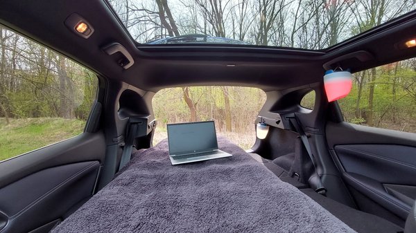 Ez az életmód nekem még a végleteket súrolja, de sokszor érzem én is, hogy több órányi számítógép előtt görnyedést, Excel kimutatások készítését és órákon át tartó konferenciahívásokat szívesebben bonyolítanék valami zöldebb, madárcsicsergős környezetben. A helyszín adott volt, a közeli erdő nyugalmánál többre nem is lehetne vágyni, így hivatalosan az erdő szélét nyilvánítottuk irodának, viszont az autó ülésében üldögélni órákon keresztül és onnan dolgozni elég monoton lett volna, úgyhogy egy kényelmes hálószoba is berendezésre került az autóban.