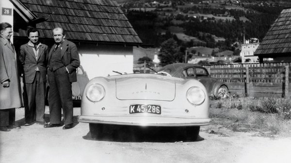 1949-1974. Az 25 év, csakhogy a most ünnepelt 75-öt meg 1948-tól számítja a Porsche, hiszen ez a fotó Erwin Komenda, Ferry Porsche, Ferdinand Porsche és a 356 Nr. 1 Roadster főszereplésével 1948 nyarán készült:
