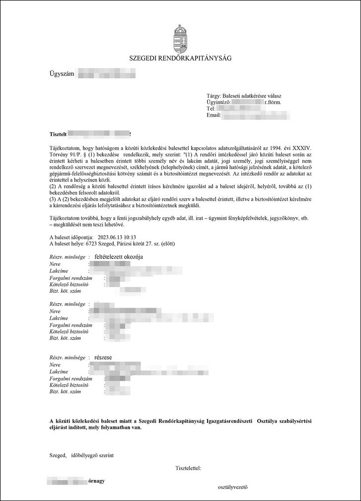 Olvasónk ennek tudatában a helyszínelést végző rendőrséghez fordult a biztosítási ügyintézéshez szükséges adatok és jegyzőkönyv kikérése céljából. Meglepetésére azonban a rendőrség csupán a baleset részeseire vonatkozó alapvető adatokat adta ki, a helyszínen készített jegyzőkönyv másolatát nem. Válasziratukban külön kiemelték, miszerint: