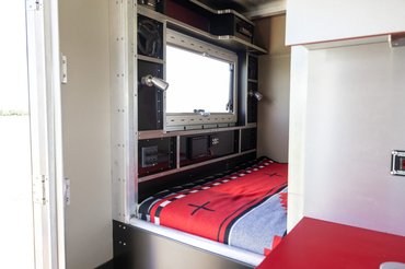A lakrész fülkéjét egyedileg készítették alumíniumból, és megszórták rengeteg praktikus funkcióval. Vannak zárható külső tárolók, tetőablak, lehajtható rész, ami mögött grillsütőnek is jutott hely, plusz sok ehhez hasonló okosság. Alap, hogy van generátor is, inverter, sőt, még gázolajjal működő fűtés is. A friss víznek egy 340 literes tartályt szereltek be.