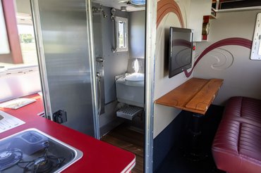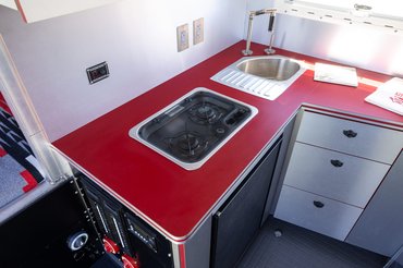 A vezetőfülkében is van minden, ami kellhet: légrugós ülések, Garmin navi, JVC hangcucc, zárható tárolók, légkürt és a nélkülözhetetlen CB rádió. A lakrészben a szekrények és a falak fehérek, amiket fekete és piros részletekkel dobtak fel. Van konyha főzőlappal és hűtővel, légkondi, tévé és csomó konnektor. Sőt, leválasztott hálószoba és komplett fürdőszoba is akad.
