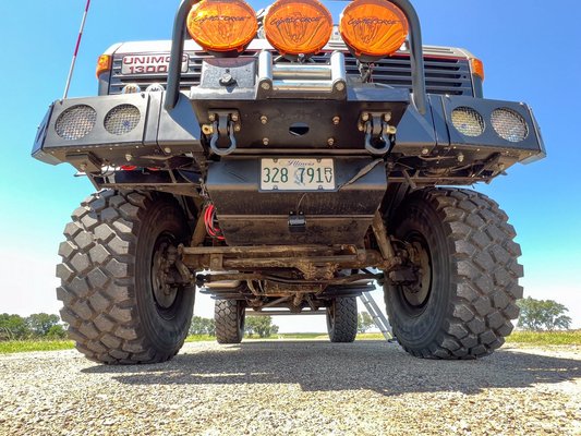 A valószínűleg a katonaságtól származó Unimog összkerekes, elöl és hátul portáltengelyes, illetve zárható differenciálművei is vannak. Tehát fokozottan alkalmas a természetjárásra. Ebben segítenek a jelenlegi tulaj által felszerelt, 20 colos alufelnikre húzott 395/85-ös Michelin terepgumik is.