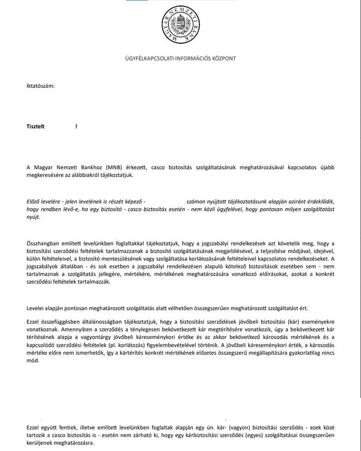 Analógiával élve: odamegyek a piacon az árus nénihez dinnyét venni, és azt mondja, hogy 500 forint lesz, de nem mondja meg, hogy fél kilós, vagy tizenöt kilós, hanem elirányít a dinnyekamarához, mert ők tudják megmondani tízezer forintért cserébe, hogy ebben az évben mekkora dinnyék járnak a vásárlóknak. Szóval ez érdekelne, hogy ez így rendben van-e, nem tisztességtelen-e ez a viselkedése a biztosítónak, és hogy mit tudok tenni?