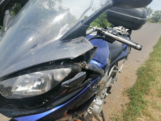 Motorkerékpárral országúton kb.: 75 km/h-val utazva balról a motor oldalának ugrott egy őz. Komoly sérülés nem történt, a vad el is tudott menekülni, de a Yamaha FZ6 az oldalára dőlve csúszott tíz métert. Ettől letört a váltókar, görbült a lábtartó, a hátsó doboz és első idom tört, segédváz meghajlott. KGFB tudjuk, hogy nem áll helyt, de van CASCO.