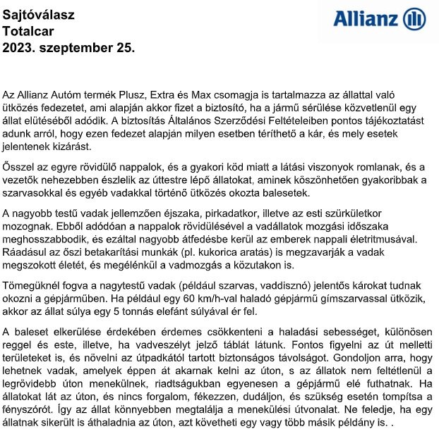 Feltettem kérdéseimet az Allianz Hungária Zrt. ügyfélszolgálatának. Többek között arra kerestem a választ, hogy „biztosítótársaságuk milyen jogértelmezésre/jogalkalmazási gyakorlatra alapozza a vadkár-töréskár jogintézményeinek szétválasztását?"
