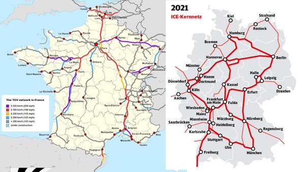 A németek úgy gondolták, hogy a hálózatnak minden várost össze kell kötnie, ezért ugyan a vonatok valamivel lassabban haladnak, mint a franciáknál, a városok valójában sokkal közelebb kerültek egymáshoz. Országon áthaladó kapcsolatok jöttek létre, nem érnek véget a vonatok a hálózat közepén. A hatás látható is, hiszen míg a németek folyamatos kapacitáshiánnyal küzdenek – azaz mindenki vonattal jár és hatalmas az érdeklődés-, a franciák a magyar IC-khez hasonlóan célirányosan, másodlagos összekötő szerep nélkül küldik a TGV-ket a vidéki városokba, annyi különbséggel, hogy csak ritkán késnek és általában nem 120-szal, hanem 320-szal mennek.