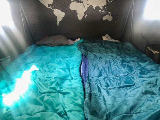 Bár a Volvo XC70 Cross Country avagy Camper Gustafsson részben úgy lett kiválasztva, hogy benne is egész kényelmesen lehet aludni, de ez egyelőre inkább csak elméleti lehetőség, hiszen szerencsére a tetőn ott a tetősátor.
