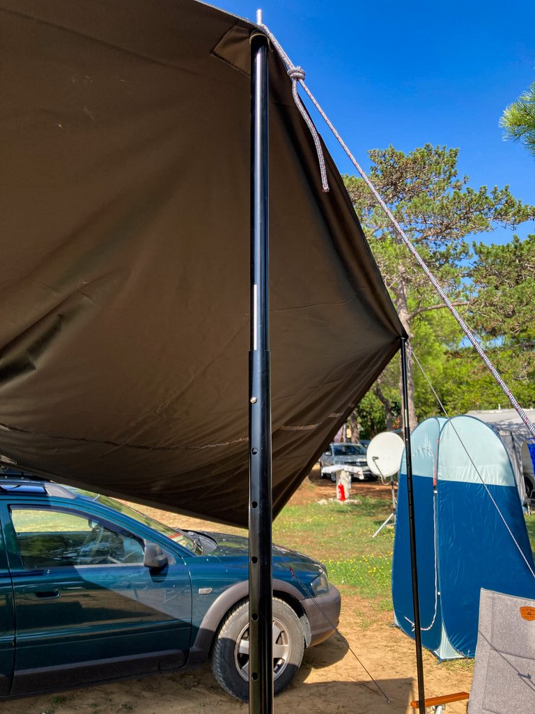 Mindezekkel együtt elég jó móka volt, és végre volt kellő nyomás (tűző napfény, no árnyék), hogy kinyicsomagoljam az sátor napvédő előtetejét. Mindig kicsit féltem tőle, hogy órákig fogok szenvedni a környező közönség nagy örömére, de meglepően flottul sikerült. Vannak olyan előtetők, amiken átmegy a létra, itt a tető kocsi felőli oldala magához a sátor tetejéhez rögzül, elég masszívan odacipzározva. Itt látszik, hogy számítottak arra, hogy a feszítő erő (szél, alaposan meghúzott feszítőkábelek) kinyitja a cipzárt, így a végét egy biztosító füllel lehet lezárni. A ponyva hat ringlit (rögzítő karikát) tartalmaz, alapból négy lábat kapunk hozzá, a maradék kettőt a végén tudjuk feszítő kötéllel rögzíteni. A lábak több szintben állíthatók, ami most jól is jött, mert a kocsi magassága miatt különben elég alacsony lett volna tető. Lehet még rendelni hozzá lábakat a maradék két helyre, én a mostani konfiggal tuti kérnék a magasság miatt. Ezen felül lehet még lezáróponyvát is kérni a szélekre, hogy jobban védve legyen a tábor a naptól, esőtől. Ez utóbbi esetén persze nem árt minél jobban kifeszíteni és ügyesebben beállítani a magasságot (nem úgy mint ahogy én tettem), hogy ne gyűljön fel a tetőn a víz.