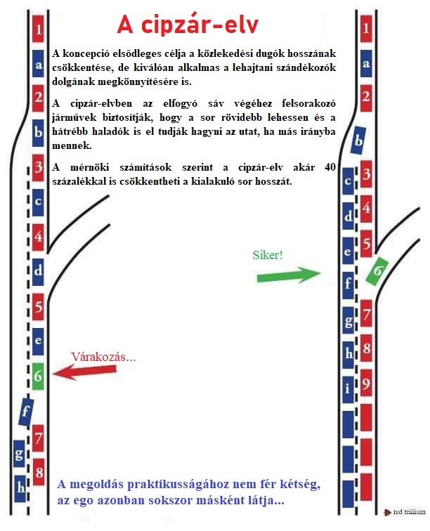 Az biztos, hogy az elméletben nincs hiba. Ha betartjuk a cipzárelvet és mindenki egy autóst (de nem többet!) beenged maga elé, akkor hamarabb oldódik a torlódás és elkerülhetők a koccanások is. Eddig az elmélet.