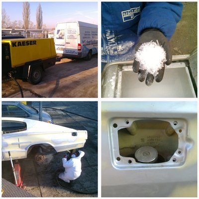 „Ezzel a tisztítással elsősorban a gépkocsik alsó részein és motorterében, a sokéves használat alatt lerakódott szennyeződéseket és az utólagos alvázvédő rétegeket tudjuk eltávolítani. A megtisztított felületek nem sérülnek, műanyag, gumi és mindenféle fém felületen alkalmazható a tisztítási eljárás, az autót nem kell megbontani a tisztításhoz. Erős felületi korrózió (leveles rozsda) esetében nem a szárazjeges tisztítás a legjobb módszer, de a kisebb rozsdafoltok vagy enyhe felületi korrózió esetén kielégítő eredménnyel alkalmazható – mondja a Szárazjég Kft. ügyvezetője, Gáspár Béla, aki a Chargert is vállalta. A módszer karosszéria festékeltávolításra is alkalmazható, de lassú, ezért nem gazdaságos. Maga a módszer hasonló elven működik, mint a homokszórás. A tisztítógép nagy nyomású levegővel együtt szórja a szárazjégdarabkákat (-78,5°C hőmérsékletű, szilárd halmazállapotú CO<sub>2</sub> gáz) a felületre. Ezek a becsapódáskor hirtelen lehűtik a szennyeződést, az a nagy hideg hatására összezsugorodik és elválik a felülettől. Ezt követően a szóróanyag újra gáznemű lesz (szublimál), a szennyeződés pedig lehullik.” András hozzáteszi, hogy gyakorlatban is szinte ennyire jól működött az eljárás, de ez nem jelentette azt persze, hogy utána a nehezen hozzáférhető részeken nem maradt neki pár órányi, hagyományos hőlégfúvós megoldást igénylő vakarás, amitől tetőtől-talpig feketék lettek.