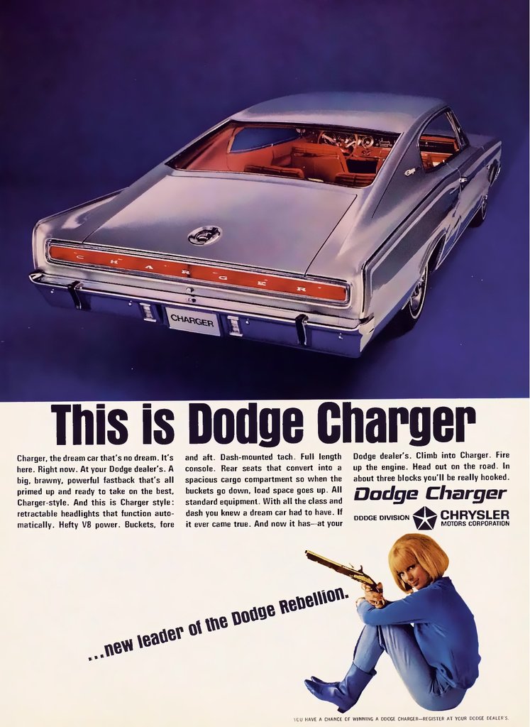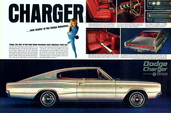 1966-ban a Dodge óriási médiakampányba fogott a Charger reklámozására. Felkérték a gyönyörűen beszélő és szép, két Elvis Presley filmben is játszott Pamela Austin színésznőt, aki mindenféle körülmények között reklámozta a kocsit – leesett innen-onnan, ágyút sütött el, dinamitokkal megrakott vasúti hajtánnyal menekült, miközben azt sugározta, hogy a Charger a tökéletes jármű az utcai harcokra, amikor is Amerika utcáin mindenki üldözött mindenkit.