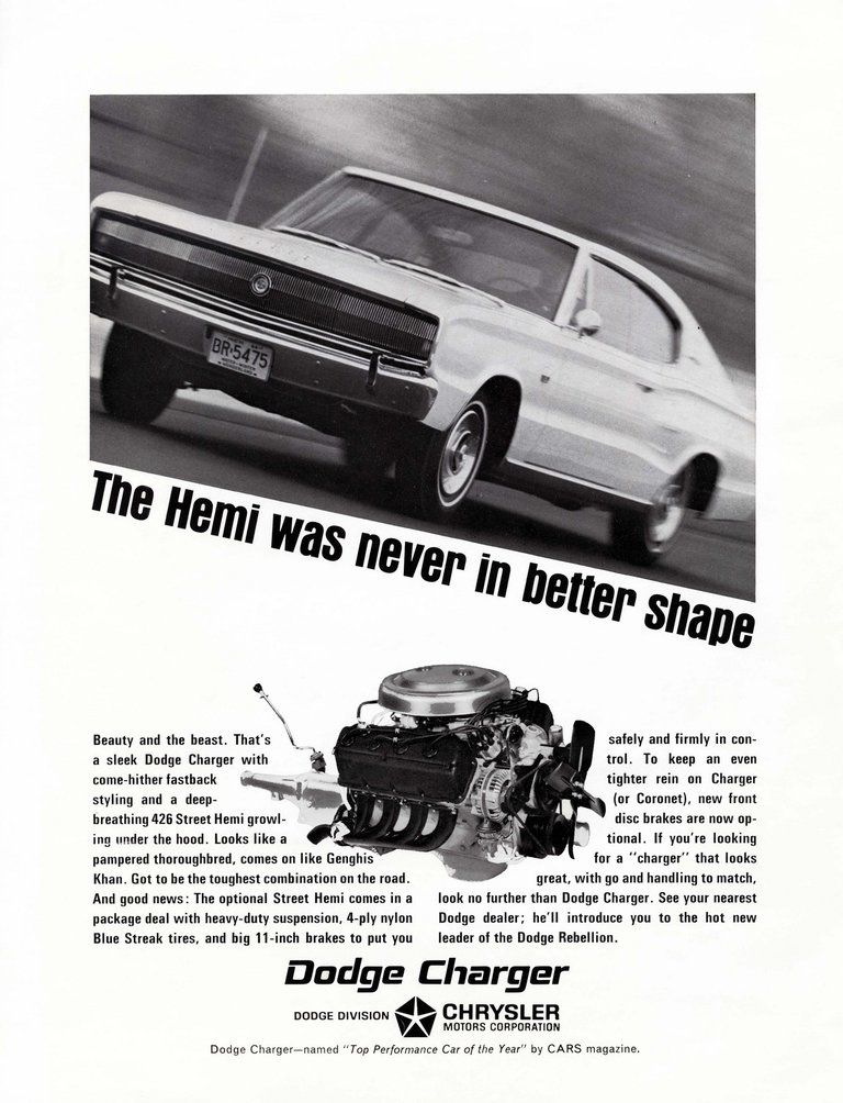 Hatalmas, a rendelkezésre álló parkolóhelyet maximálisan betöltő méretű, lejtett hátú kocsi lett, amelyet oltári V8-asokkal szereltek. Muszklijait igazi versenyautós közegben edzették, a Dodge 1966-ban a NASCAR és az USAC körökön egyaránt erősítette a Charger imázsát, és ezt olyan motorválasztékkal, mint a 426 köbhüvelykes (hétezer köbcentiméteres) Hemi – amivel mindenkit rettegésben lehetett tartani a motorway-en – költöztették az utakra. Csoda, ha minden rosszfiú ilyen fenyegető megjelenésű kocsival járt, vagy akart járni a hatvanas évek végén Amerikában?!