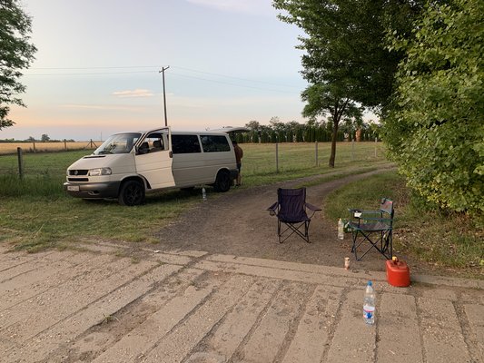 A parádsasvári szállásunk udvarára se volt olyan megnyugtató bepasszírozni a Tourneót. A beállóra nem merőleges kapun éppen befért, de a ház és a szomszéd kerítése között kis túlzással cipőkanállal fért el a tükrök nélkül is egy centi híján két méter széles kisbusz. Itt azonban sokat segítettek a nagy tükrök és az is, hogy az autó oldala lapszerű.