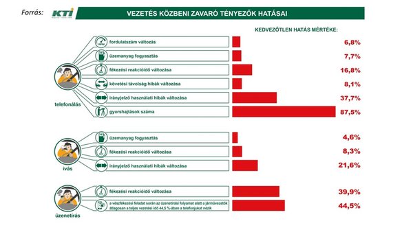 A cikk szerint használni tilos vezetés közben a mobiltelefont a gépjárművezetőknek. Hogy mire tilos használni? Lényegégben mindenre! Mert minden másnál nagyobb mértékben vonja el a figyelmet a vezetéstől. A Közlekedéstudományi és Logisztikai Intézet vizsgálatai szerint ugyanis a mobiltelefonálás nagyon elvonja a figyelmet a vezetéstől, ahogy ez az alábbi ábrán látszik.