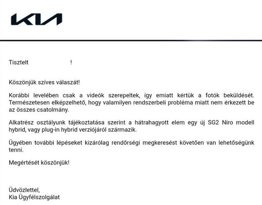 A Kia Hungary-t hívtam mint említettem feljebb, visszahívást kaptam, elmondtam a történetet, majd kis időt kértek. Mikor visszahívtak sajnos már nem tudtam felvenni. Azóta nem kerestek. Tegnap ismét felhívtam őket, és írtam egy e-mailt, csatolva minden bizonyítékot és a sérült autó fényképeit.