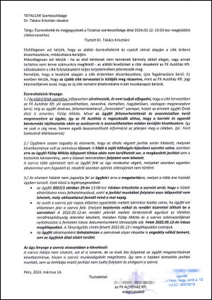 A szerviz több ajánlatot tett az ügyfél felé az ügy rendezése végett, melyeket azonban egyetlen alkalommal sem fogadott el, részéről azonban ajánlat, ellenajánlat nem történt.