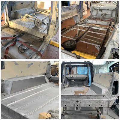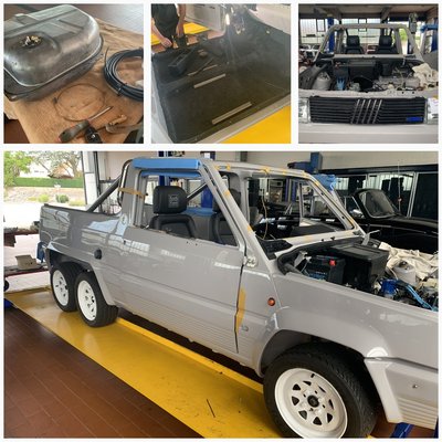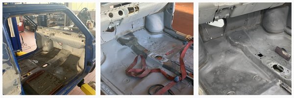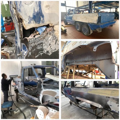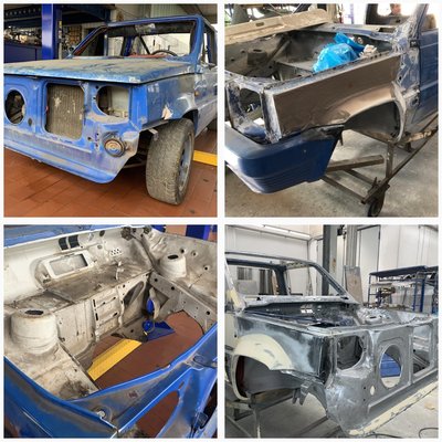 A motort menthetőnek ítélték, de a karosszéria esetében alaposabb munkát igényelt a Panda: először azt hitték, elég, ha lefújják róla szárazjéggel a festéket, de végül a homokfúvás és a gitt kézzel történő eltávolítása mellett döntöttek – kellett a nehéztüzérség. Előkerültek a rozsdás és lyukas felületek, a sérült és hajlott fémlemezek. Sokkal több feladatot adott a karosszériamunka, mint elsőre gondolták. A megsemmisült fémlemezeket eltávolították és újakat helyeztek fel. Az oldalát elöl, s a plató részt is újjá kellett építeni. Teljesen. Új minden, a kerékjárati ívek, az oldalfal, a padlólemez. A kabinban a taposólemezek is, a tűzfal.
