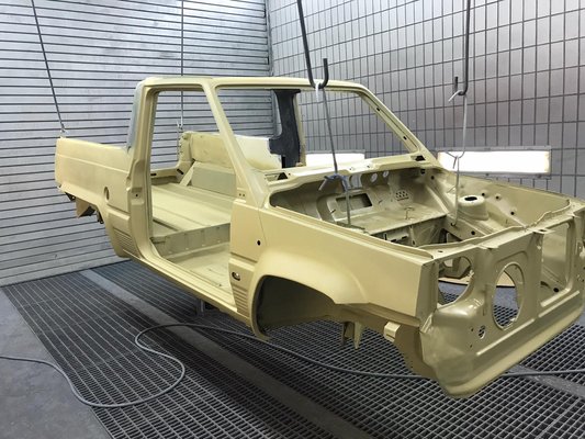 Az új karosszériaelemek felszerelése és a karosszériamunkák befejezése után a jármű üreg- és alvázvédelmet kapott, majd átgurították a fényezőhöz. A fényezés már gyerekjáték volt, nem kellett sok gitt sem. Az eredeti színe kék volt, azonban most ezüst, vagy inkább talán galambszürke színt kapott, ez talán jobban kiemeli a vonalait, meg ez most divatos is, s ha matricázni szeretnék, ez a legjobb alap hozzá. A plató belseje piros volt, az is ugyanolyan lett, mint a külső szín.