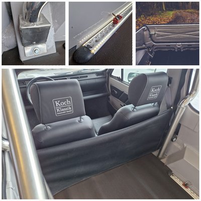 Eredetileg a két ülés feletti tető is ponyvát kapott – ugye mondtam, hogy korábban nyitott tetejű Pandák átépítésével foglalkoztak? – de, ezt most lecserélték. A teherautó ponyvát egy betolható plexi lap váltotta, s a korábban a rakteret fedő ponyvát is elhagyták már. Az utastér és a raktér közötti hátfal viszont zipzárral rögzített, műanyag ablakot kapott ponyva, s azt ki is lehet emelni.