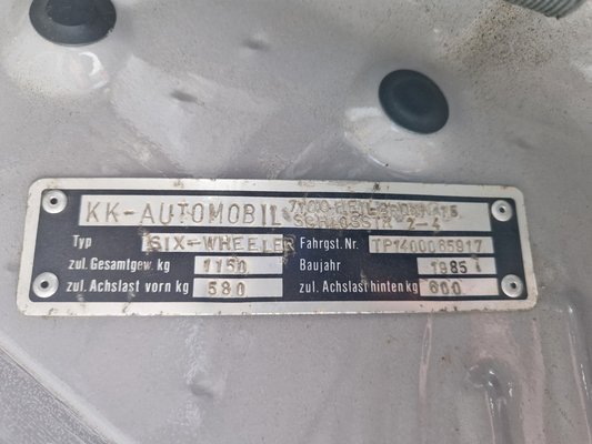 Időközben már regisztrált gyártónak minősültek, így a Fiat már nem Fiat hivatalosan, hanem a KK-Automobil cég terméke, ez szerepel az 1985-ös kocsi típustábláján is gyártóként, típusként pedig a Six-Wheeler név, bár a forgalmijában Panda 6 Wheel olvasható. Szóval teljesen legális, még a hosszabb kipufogórendszer is be van jegyezve a forgalmiba – hiába, Németországban ez így szokás.