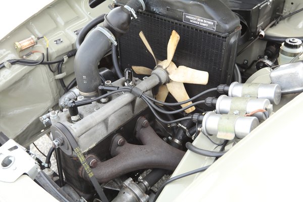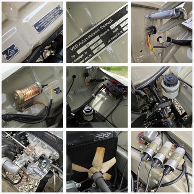 Jópár mosolyogtató megoldást tartogat a motortér is. „Például van egy 1-est ábrázoló plakett, ami az első osztályú minőséget tanúsítja. Bár, én még nem láttam olyan Wartburgot amelyikben ne lett volna ilyen. A géptetőt két rugó tartja, pálcákkal nem kell bíbelődni. A világítás a motortértető nyitásakor automatikusan kapcsolódik. Különben mindenhez jól hozzá lehet férni, szellős a berendezés, a szerelés nem jelenthet gondot. A hűtő zsalui állíthatóak, téli és nyári üzemmódot tud a rendszer” – meséli Gyula.