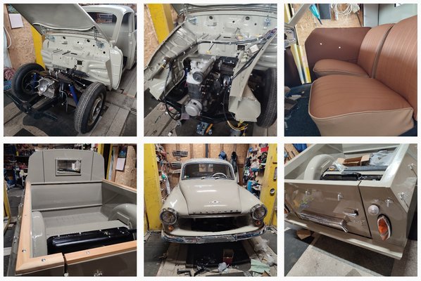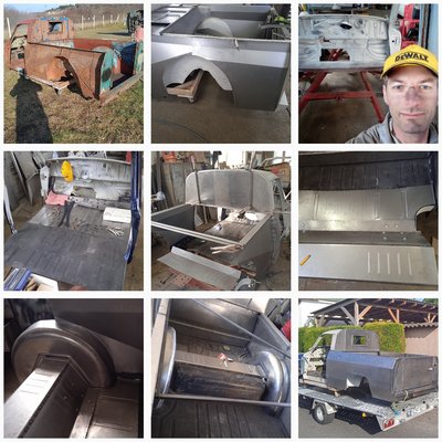 Bár a karosszériája menthető állapotban volt, de erősen hiányos volt ez az alap. Hiányoztak az ablakai s a belseje is, szerencsére a motorja az meg volt – darabokban, szétszedve. S a fa platóra sem emlékeztetett már semmi.