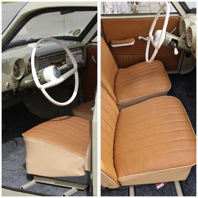 A kocsi egyik fénypontja a kabin. Lényegében teljesen új. S nemcsak a véghelyzetei között négy tekeréssel mozgatható oldalablakot takaró burkolat, az ülések, a műszerfal is. Szóval minden újraszületett itt, talán csak pár kapcsoló maradt a régi s a műszerpark. Ahogy lámpákat, kapcsolókat és sebességmérő- valamint kombinált műszereket is lehet még beszerezni – tán' épp azért, mert megbízhatóan működnek, s nem kell cserélni őket. A kormány közepén embléma, s aranyos az is, hogy a gyújtáskapcsoló a kormány bal oldalára került, a kézifékkar pedig a kormányoszlop alá, a fényváltót lábbal kell kezelni. Míves munka a kesztyűtartó fedele, a rádió pedig megbecsült extra ma is, s volt annakidején is.